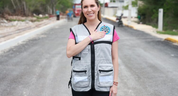 Atenea Gómez Ricalde supervisa pavimentación en la colonia San Valentín en Ciudad Mujeres