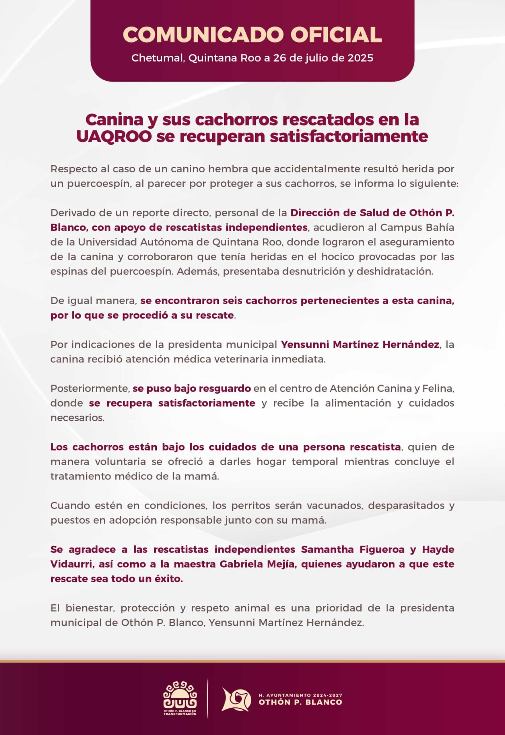 CHETUMAL, 26 de julio. Respecto al caso de un canino hembra que accidentalmente resultó herida por un puercoespín, al parecer por proteger a sus cachorros, se informa lo siguiente: