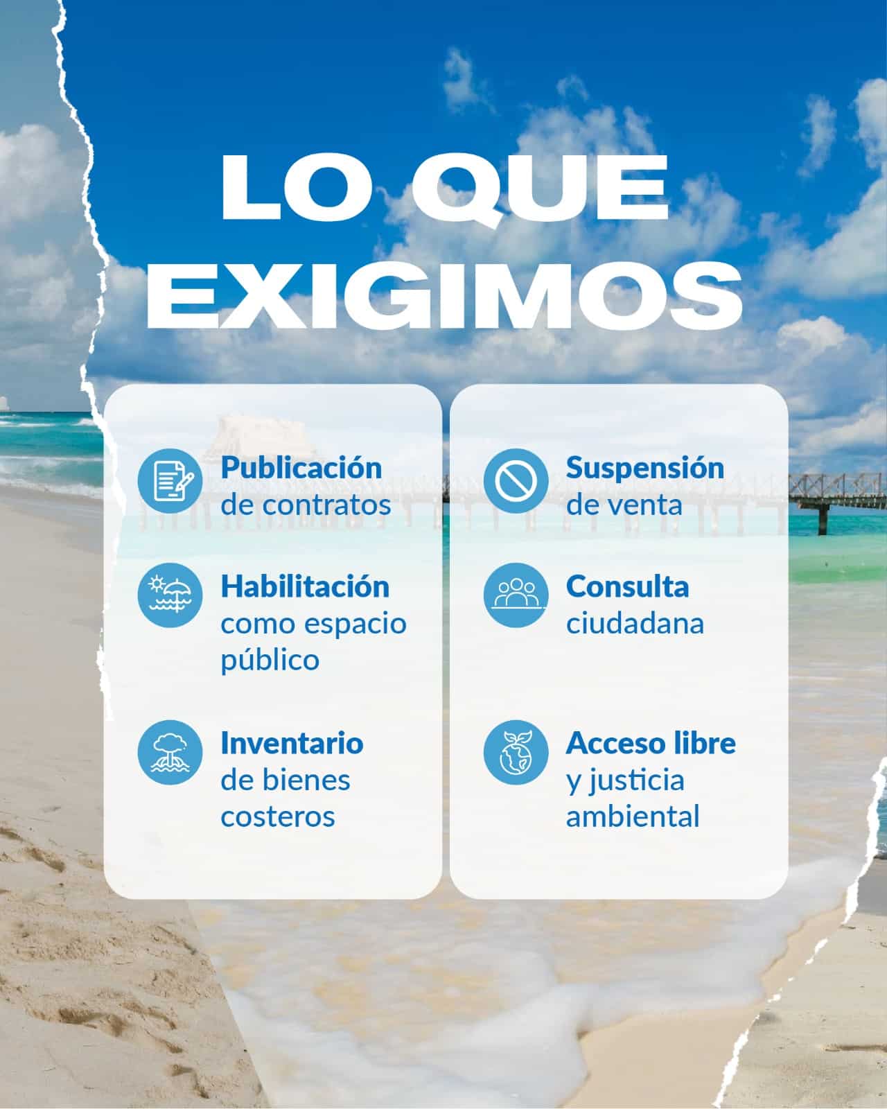 Afirmaron que no permitirán que el acceso al mar se siga reduciendo hasta desaparecer detrás de bardas, hoteles y contratos privados, ya que el acceso a las playas es un derecho y el acceso a los servicios ambientales es el medio para ejercer el derecho al medio ambiente sano.
