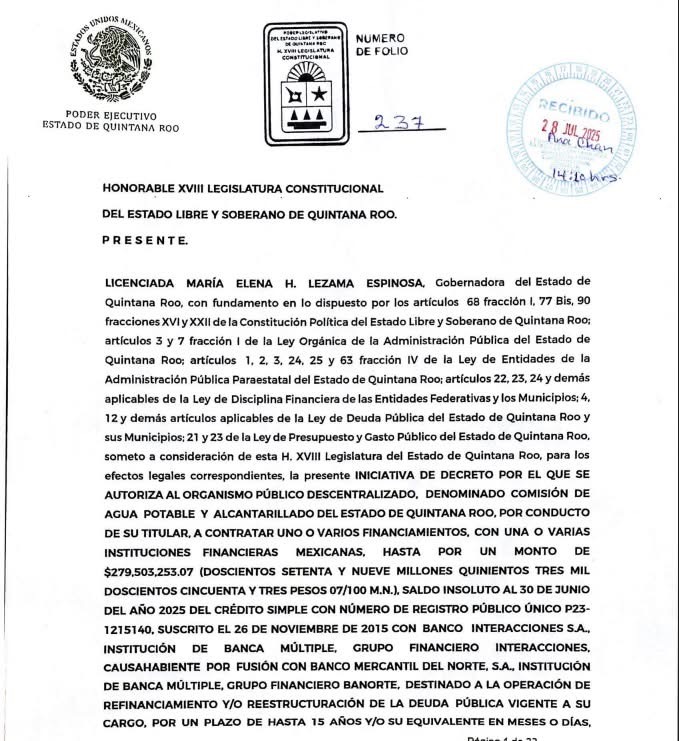 La iniciativa firmada por la gobernadora Mara Lezama será aprobada rápidamente, puesto que inmediatamente después de su admisión formal en la sesión de este día, la Diputación Permanente convocó al pleno de la legislatura a realizar un período extraordinario de sesiones mañana martes 5 de agosto a las 4 de la tarde, en donde el punto principal será la aprobación del crédito para reestructuración de deuda1.