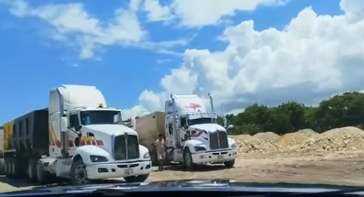 El material pétreo es trasladado en volquetes y tráileres, inclusive de doble remolque, desde el ejido Juan Sarabia, bastante alejado de este punto que se encuentra cerca de la gasolinería de Majahual y del camino a Pulticub.