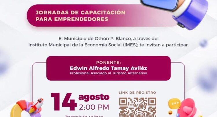 El gobierno de Othón P. Blanco que encabeza la presidenta municipal Yensunni Martínez, a través del Instituto Municipal de Economía Social (IMES), invita a las y los emprendedores a participar en las Jornadas de Capacitación para Emprendedores, las cuales ya dieron inicio y se imparten a través de la plataforma Zoom.