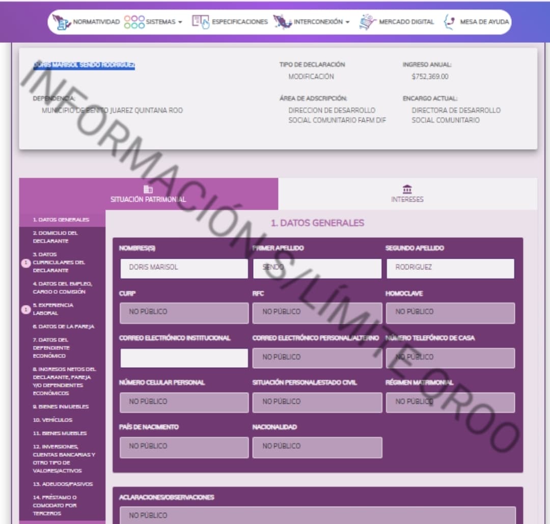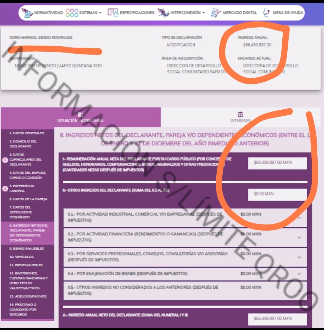 La directora del Sistema Integral de la Familia del DIF municipal del municipio de Benito Juárez, Quintana Roo Doris Marisol Sendo Rodríguez, un año antes de las campañas electorales (2023) reportó haber obtenido de ingresos al fisco por $66 millones 450 mil 887 pesos libres de impuestos.
