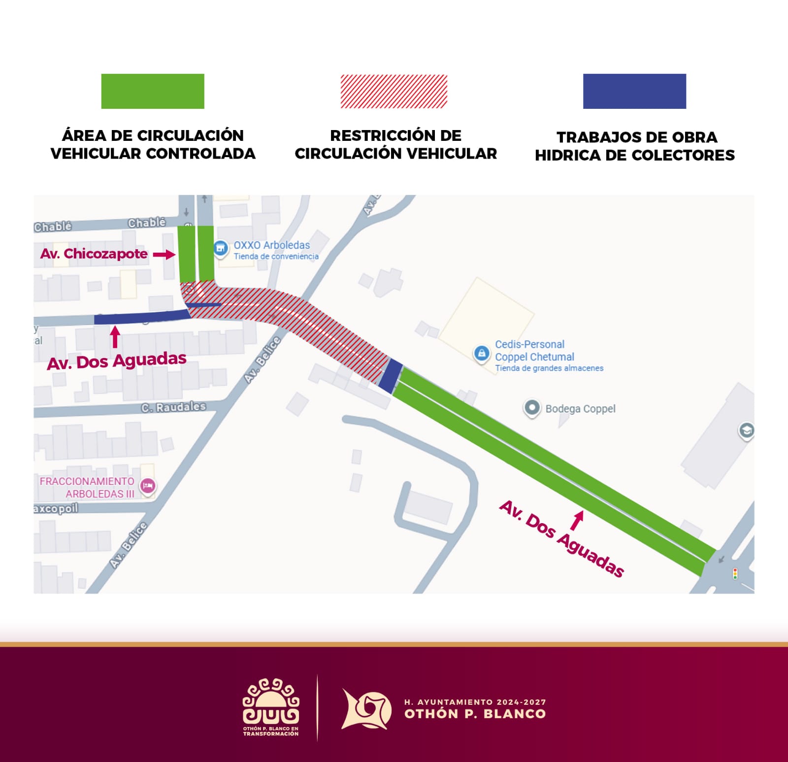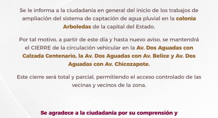 Por tal motivo, a partir de este día y hasta nuevo aviso, se mantendrá el CIERRE de la circulación vehicular en la Av. Dos Aguadas con Calzada Centenario, la Av. Dos Aguadas con Av. Belice y Av. Dos Aguadas con Av. Chicozapote.