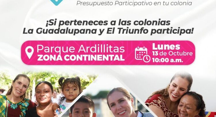 El próximo lunes 13 de octubre a las 10:00 horas, se llevará a cabo la mesa de trabajo para las colonias La Guadalupana y El Triunfo, en el Parque Ardillitas de la Zona Continental, mientras que el jueves 16 de octubre a las 17:30 horas, será el turno de la colonia Salina Chica, en el Kiosko del Parque de Las Gaviotas.