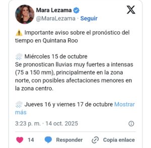 De acuerdo con los reportes meteorológicos, para hoy martes 14 y 15 de octubre se esperan lluvias muy fuertes a intensas (de 75 a 150 milímetros), principalmente en la zona norte de Quintana Roo, con posibles afectaciones menores en la zona centro.