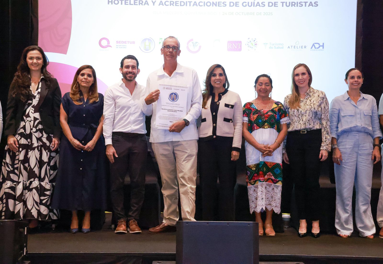 Isla Mujeres, Quintana Roo, 25 de octubre de 2025. – En el hotel ATELIER Playa Mujeres, se llevó a cabo la Entrega de Reconocimientos de Estándares de Calidad Turística, Clasificación Hotelera y Acreditaciones de Guías de Turistas, un evento encabezado por la Gobernadora del Estado, Mara Lezama, y que contó con la asistencia de la Presidenta Municipal de Isla Mujeres, Atenea Gómez Ricalde.