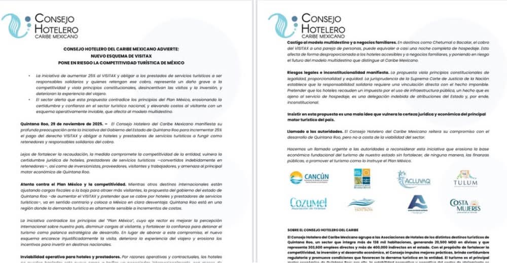 Al conocer esta medida, el Consejo Hotelero del Caribe Mexicano (CHCM), organización que aglutina a las asociaciones de hoteles de todo el estado, emitió una postura de rechazo al aumento y el nuevo esquema del Visitax, con la advertencia de que representa un daño grave a la competitividad de México y viola principios constitucionales, desincentiva las visitas y la inversión, y deteriora la experiencia del viajero.