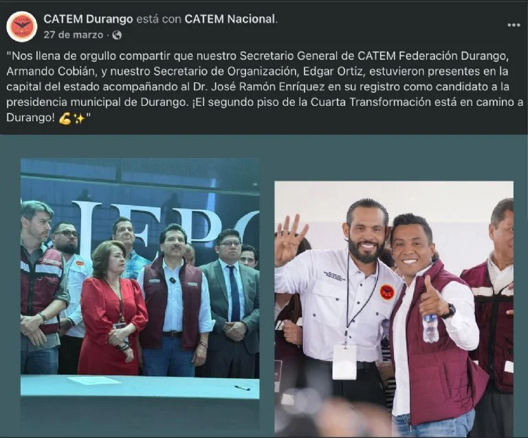Según muestra la página de Facebook de la CATEM Durango, Edgar “N” es secretario de organización y llegó a acompañar José Ramón Enríquez en su registro como candidato a la presidencia municipal de Durango por Morena, además de ir a la Cámara de Diputados para participar en la Comisión del Trabajo y Previsión Social en el mes de abril de este año