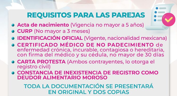 Vicencio Jiménez, reiteró que entre los requisitos que deben presentar las parejas, están el acta de nacimiento no mayor a 5 años, identificación oficial vigente, certificado médico de no padecimiento de enfermedad crónica, carta protesta y constancia de inexistencia de registro como deudor alimentario moroso.