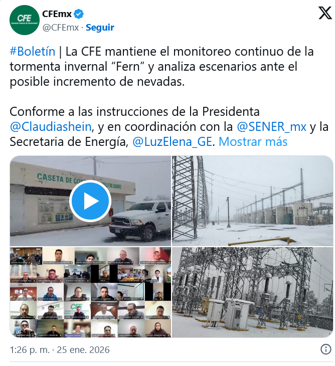 La Sener y la CFE informaron que se mantienen atentas del comportamiento de la tormenta invernal “Fern” y su posible impacto en el Sistema Interconectado Nacional