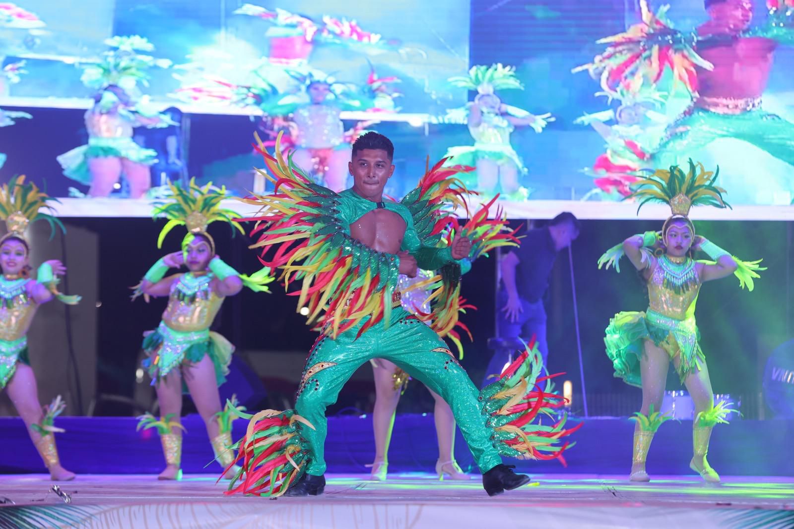 La noche continuó con la presentación de la comparsa “Fusión del Caribe”, que llenó el escenario de ritmo y energía, seguida de una emotiva mención a todas y todos los ex Reyes del Carnaval de los años 2023, 2024 y 2025, a quienes se reconoció su aportación.
