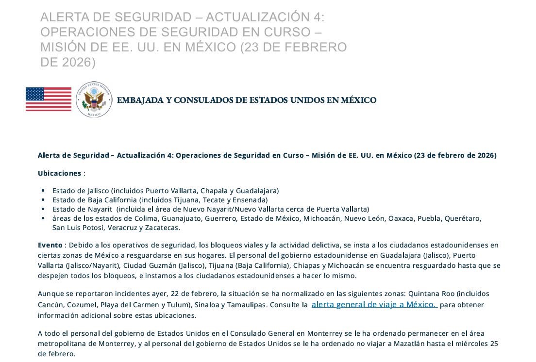 Poco después del mediodía de este lunes, la embajada emitió una nueva actualización de su alerta dirigida a sus nacionales residentes y visitantes, en la que informa que, aunque se reportaron incidentes ayer, 22 de febrero, la situación se ha normalizado en Cancún, Cozumel, Playa del Carmen y Tulum, Quintana Roo, así como en Sinaloa y Tamaulipas.