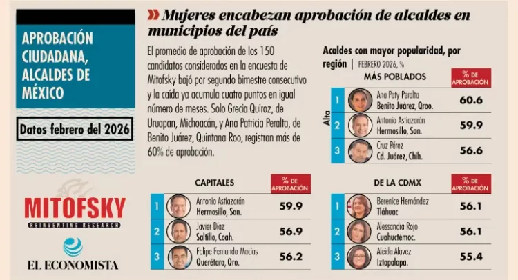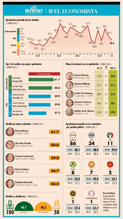 La aprobación promedio de 150 alcaldes de México disminuyó en febrero de 2026 al pasar de 47.7%, en diciembre de 2025, a 46.5% según una encuesta bimestral realizada por la empresa Mitofsky para El Economista.