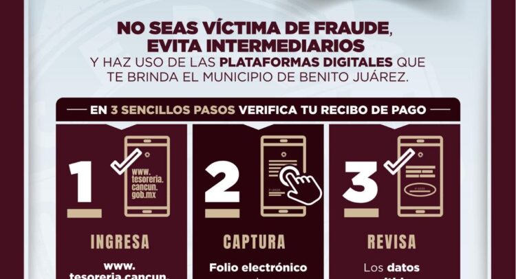 Cancún, Q. R., a 28 de febrero de 2026.- El Ayuntamiento de Benito Juárez, a través de la Dirección de Ingresos, invita a la ciudadanía a usar las plataformas digitales que cuenta el municipio como la verificación digital de recibos, una de las cinco acciones contundentes de la campaña “Cero corrupción” que tiene el propósito de consolidar una administración de resultados y con rendición de cuentas.